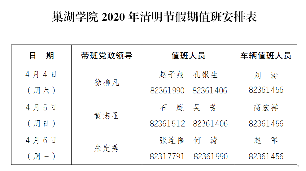 请各学院、各部门安排好放假期间的值班与安全保卫等工作,做好应对各类突发事件的预案,要求值班人员保持通信畅通。如遇重大突发事件,要按规定及时报告并妥善处理,确保假日期间校园安全。