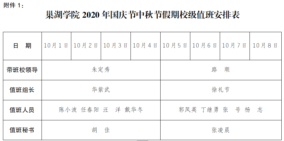 附件:1.必赢626net入口2020年国庆节中秋节假期校级值班安排表