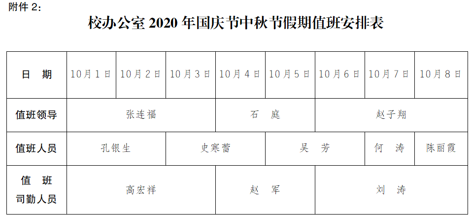 2.校办公室2020年国庆节中秋节假期值班安排表