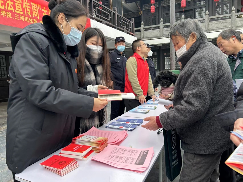 12月4日,必赢626net入口一行赴肥西县三河镇联合开展宪法宣传教育活动,双方共同为平安三河校地共建室揭牌并召开座谈会。组织专业教师、学生党员、学生干部前往三河镇万年台景区、三河镇中心学校和二龙家园(百姓评理说事点)等地进行宪法宣传,向游客及群众发放宪法宣传品及相关法律法规宣传折页,现场解答群众法律咨询,面向学生开展专题讲座,讲述生活中的宪法。