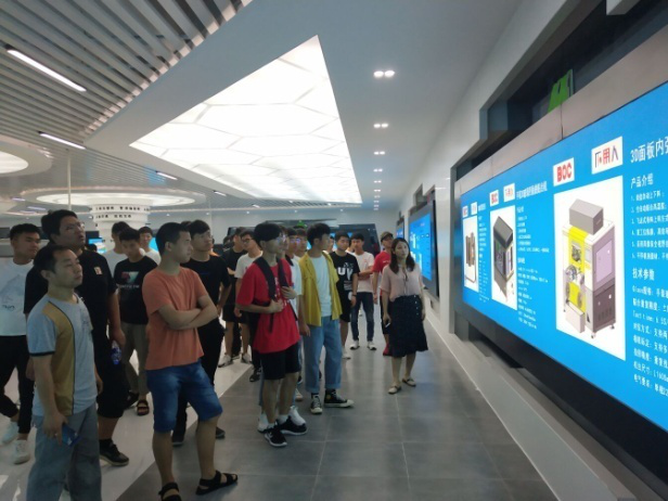 荚长慧代表中显公司欢迎大家的到来,并带领同学们逐一参观了公司的专利成果展厅、生产车间、科技展馆、员工健身娱乐室等地。期间荚长慧带领同学们对正在安装调试的某智能生产线进行了参观,并请师傅详细介绍机器的工作原理和动作过程。在见习过程中,同学们认真听讲,主动与公司技术人员进行互动交流。