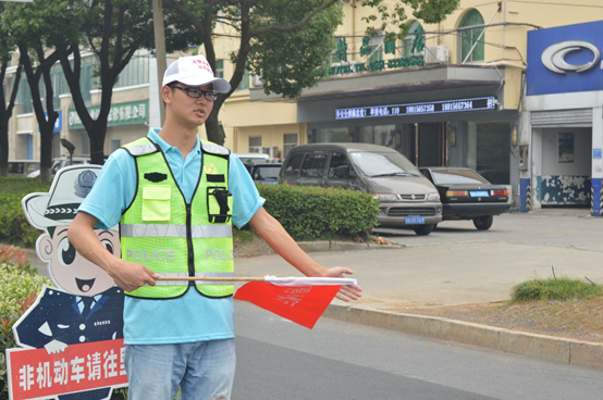 在认真记下交警同志的教导后,志愿者们正式“上岗”。他们身穿志愿交警服,手拿标有“红灯停,绿灯行”的红旗站在自己的岗位上,炎炎的烈日、飘洒的大雨都不能阻挡他们的工作热情。