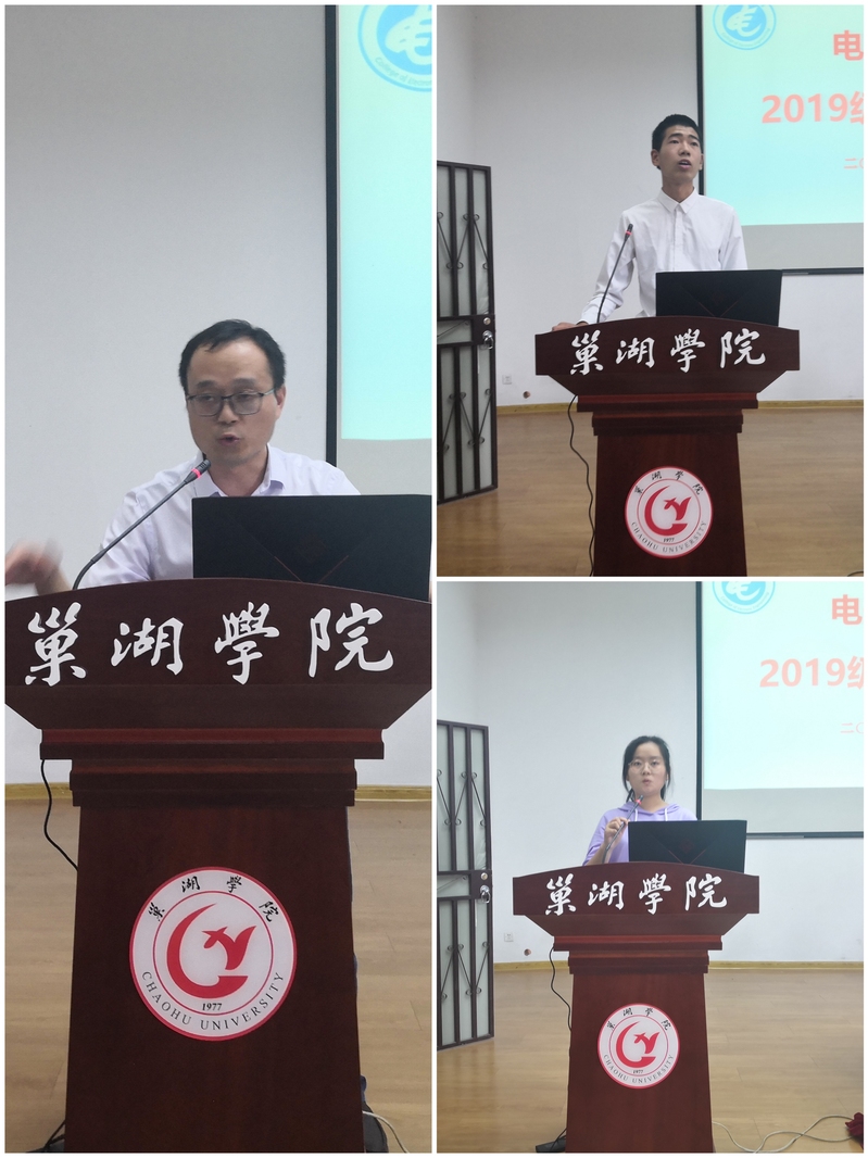 随后,许明坤作为教师代表发言,他希望同学们能够纠正过去对大学生活的错误认知,并嘱咐他们,要耐得住寂寞、经得住失败、勇于面对,学会学习、学会坚持。接着,来自17级电子科学与技术专业李波发言,他向19级新生讲述自己的学习经历,鼓励大家树立明确的目标,积极参加各项活动和赛事,提高自己的综合能力。19级电子信息工程二班的黄婉晴,代表全体新生表达自己对对未来大学生活的态度以及美好憧憬。