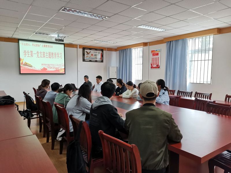 会议伊始,汪军就本支部开展“不忘初心、牢记使命”主题教育的主旨、方案作了说明,要求广大党员同学要认真学习、领会习近平《在庆祝中华人民共和国成立70周年大会上的讲话》精神,通过对新中国70年发展历程的回顾,深刻认识中华民族从站起来、富起来到强起来的伟大飞跃,进一步增强对中国特色社会主义道路自信、理论自信、制度自信和文化自信,树立爱国、爱党、爱社会主义的信念,坚定听党话跟党走的决心,争做勇于担当民族复兴大任的时代新人。接着,郑雨带领党员同志学习了习近平《在庆祝中华人民共和国成立70周年大会上的讲话》内容,并一同观看了习近平视察中共中央北京香山革命纪念地的视频。视频结束后,大家纷纷表示,要铭记党的奋斗历程,不忘初心、砥砺奋进,以“不忘初心、牢记使命”主题教育为契机,把共产党人的理想信念转化为做好本职工作的强大动力。最后,汪军在总结中希望学生党员要认真学习习近平总书记的重要讲话,在学懂、弄通、做实上下功夫,真正把“初心”和“使命”体现在对党绝对忠诚、强化政治担当上。党员学生一定要真正起到先锋模范作用,学习上努力进取,工作中开拓创新,坚定信念,始终保持奋斗精神,勇于战胜各种艰难险阻、风险挑战,争做奋发有为的新时代青年。