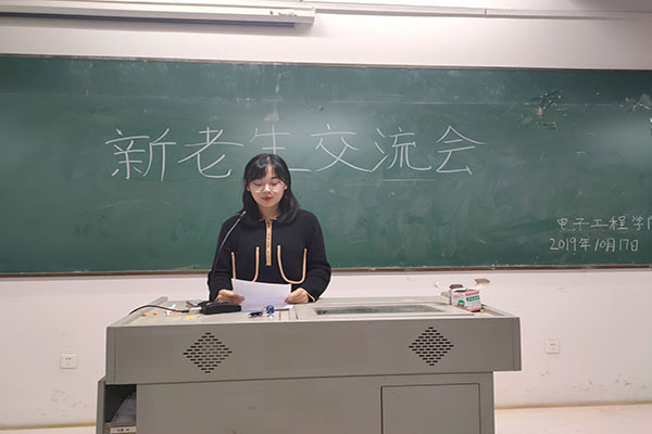 为了做好新生的思想教育和管理工作,加强学生的组织纪律观念,增强学生爱国爱校意识,促进校风、学风建设,10月17日晚,电子工程学院新老生交流会在慎思楼中302教室举行,本次活动由电子工程学院学生会女生部干事吴傲主持,电子工程学院学生会副主席张廷昊、生活部副部长尹晓楠出席,女生部全体成员及部分19级新生参加。