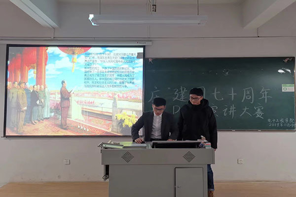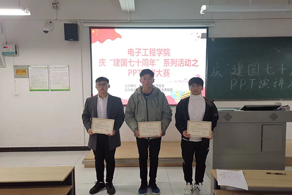 为激发当代大学生的爱国情怀,庆祝新中国成立七十周年,电子工程学院于11月29日晚在慎思楼中203、204教室举办“新中国成立七十周年”系列活动之PPT演讲大赛。此次比赛评委由电子工程学院学生干部陈阳,张廷昊,舒项辰担任,19级各班派出代表参赛。