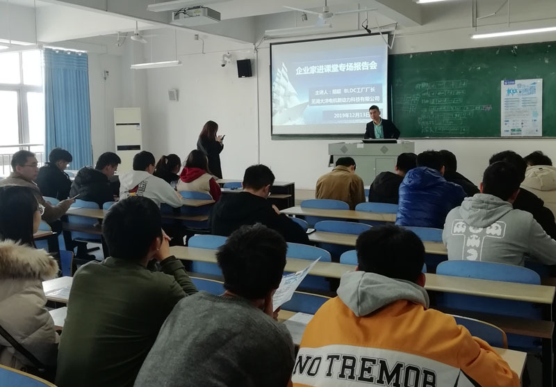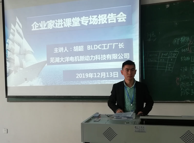 接下来,胡超与同学们分享了他本人自2010年大学毕业即进入芜湖大洋电机有限公司新动力科技有限公司后如何从一名普通的企业员工成长为BLDC工厂厂长的职业发展历程,他对自己的成长经验总结如下:一是要有明确的职业定位,目标要切合实际,有可行性,从自己擅长的岗位做起,不断提升实践工作能力;二是要培养企业的归属感,认同企业的文化,强调团队精神是促成个人成功的重要支撑;三是要有不怕吃苦、勇于创新的敬业精神。