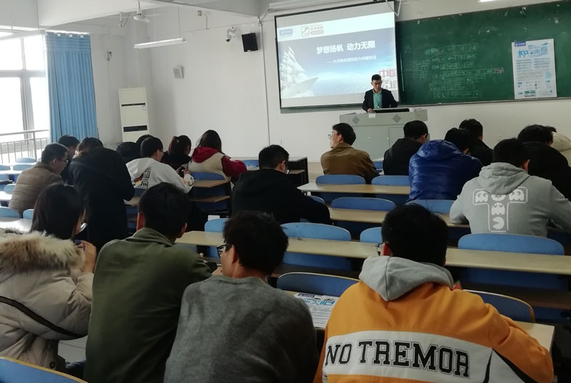 芜湖大洋电机有限公司新动力科技有限公司BLDC工厂胡超厂长介绍了公司的企业文化、招聘岗位、薪资福利、工作环境、职业发展、住宿饮食、文化活动等,并就同学们关心的问题与同学们进行了良好的互动,胡超回答了同学们关于求职、面试的具体问题,并和有意向的同学就公司的工作环境、福利待遇、职业发展等进行了交流。(文、图/汪军 审/陈海波)