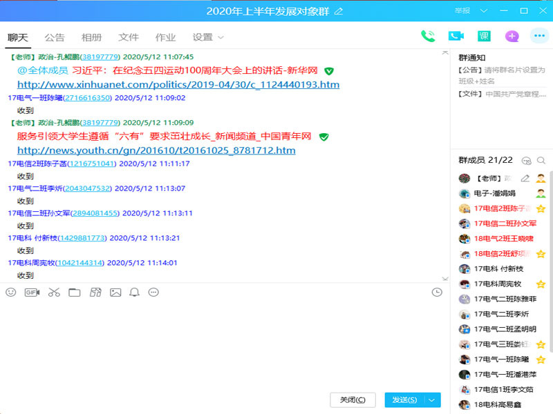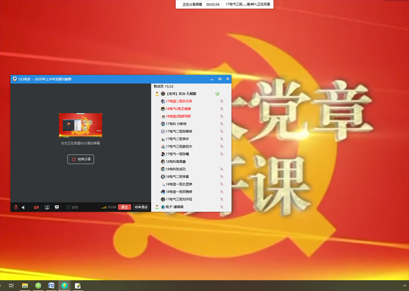 在全校上下全力抗击新冠肺炎疫情期间,为贯彻落实中国共产党党员发展工作相关规定,做好发展对象的培训教育工作,电子工程学院2020年上半年发展对象党校培训班学习以线上学习的方式展开。