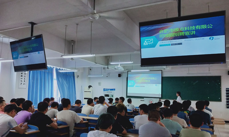 合肥市极点科技有限公司人事部经理胡玉介绍了公司的企业文化、招聘岗位、薪资福利、工作环境、职业发展、住宿饮食、文化活动等,并就同学们关心的问题与同学们进行了良好的互动,宣讲会气氛活跃,取得了良好的宣讲效果。