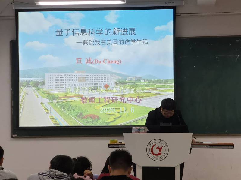 为了让同学们了解当前量子信息科学的最新进展和最新成就,认清我国在量子信息科学方面的优势和差距,2020年11月6日下午,电子工程学院数理工程研究中心副教授笪诚博士在慎思楼中301教室作了题为“量子信息科学的新进展—兼谈我在美国的访学生活”学术讲座。电子工程学院物理、电科、电信、电气以及其他学院相关专业200余名学生和部分感兴趣的专业教师聆听了报告。