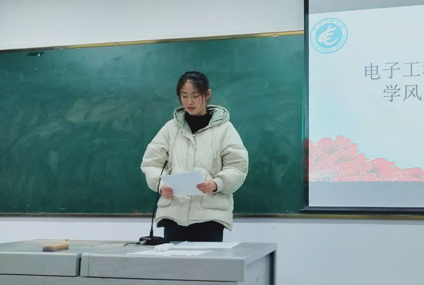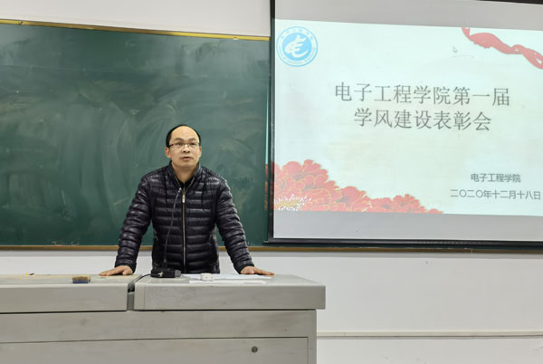 孔鲲鹏作总结发言,他指出电子工程学院历来重视学风建设,并列举了近3年来学院在学风建设方面所取得的成效及存在的问题,并就如何创建优良学风给出三点建议:一是充分认识学风建设的重要意义;二是刻苦学习,做良好学风的创立者;三是比学赶超,做良好学风的传播者。