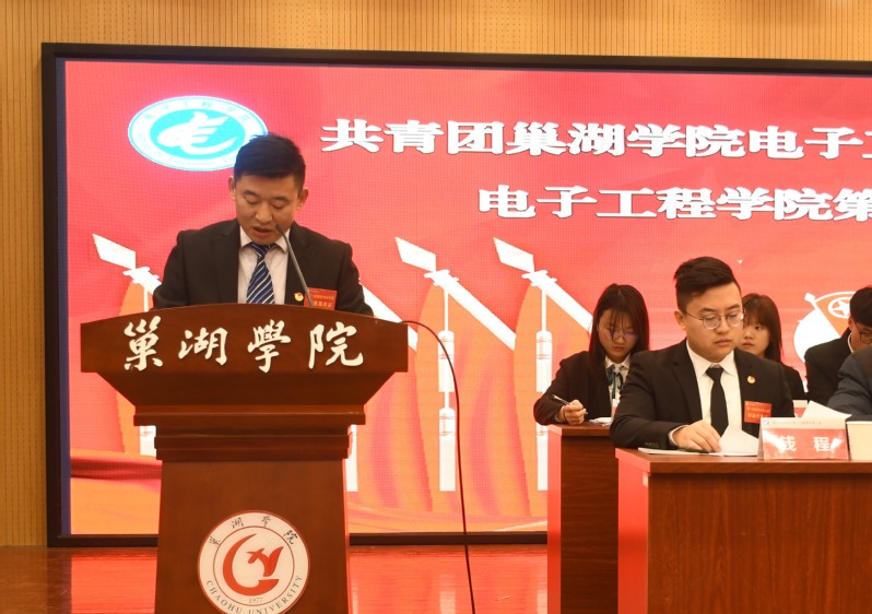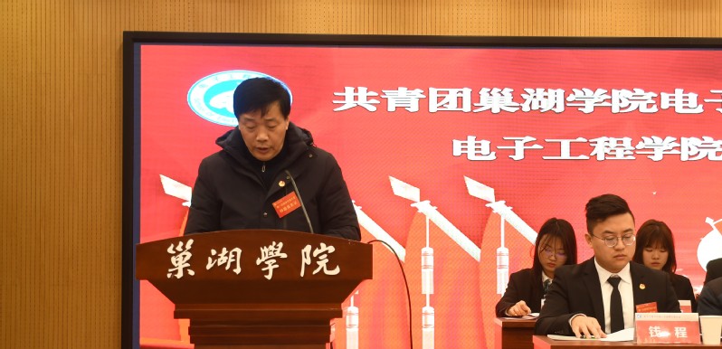 郭超代表校团委发表讲话,他回顾了近几年来电子工程学院团学工作取得的成绩,对电子工程学院团总支和学生会的工作给予了充分的肯定。同时提出了三点希望:一要强化思想引领,筑牢团员青年的理想根基;二要把握改革关键,增强团组织的凝聚力和吸引力;三要推进从严治团,发挥团干部的表率作用。