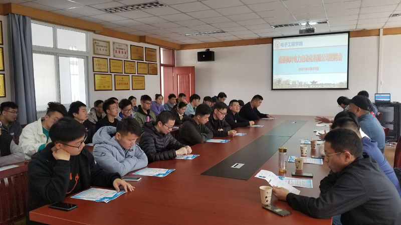 公司负责人王华首先对南通枫叶电力自动化有限公司做了总体介绍,对公司招聘电气工程师的岗位性质、要求和工作特点做了详细说明。接着,王华介绍了公司招聘岗位的职责:负责变电站,电厂,大型厂矿企业等的继电保护和电力系统自动化项目的设计、调试、现场服务。王华还列举了学院往届四名毕业生目前在该公司的工作情况向与会的同学介绍了公司的发展前景。