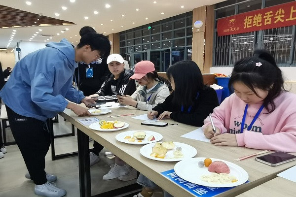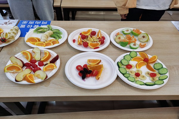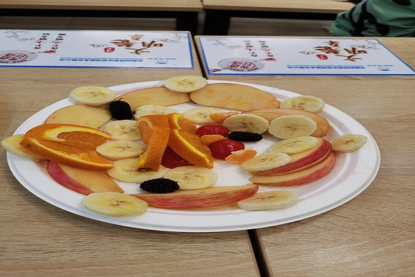 比赛伊始,参赛选手按照各自的分组运用自备水果和活动组提供的盘子制作拼盘,并在了解比赛规则之后开始现场制作。比赛过程中,每一个小组的成员都怀着无比的热情去构思水果拼盘的设计,小组成员之间互相商量,默契配合完成各自的作品。时间飞快,拼盘比赛进入了评比阶段,现场的四位评委分别给每个作品打分,最后,经过现场四位评委的慎重打分,最终选出本次比赛的三个获奖小组。