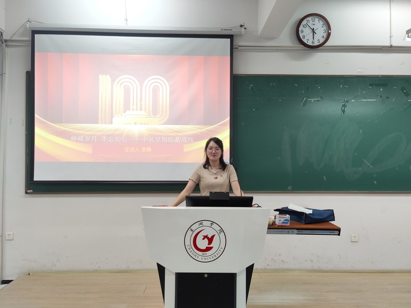6月25日下午,学校党史学习教育辅导员宣讲团成员、电子工程学院辅导员涂静于慎思楼中301教室开展以“峥嵘岁月 不忘初心——中共早期隐蔽战线”为题的党史学习教育报告会。电子工程学院和信息工程学院包括中共(预备)党员、共青团员在内近二百名学生参加。