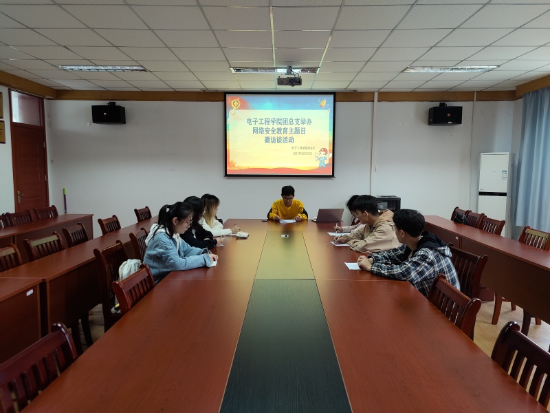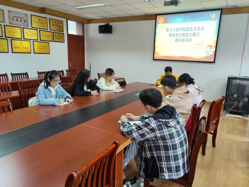 为进一步推动学校网络安全建设,加强网络安全教育宣传,10月15日中午,电子工程学院团总支于笃行楼二楼会议室举办网络安全主题日微访谈活动。此次会议由宣传部部长杨俊磊主持,宣传部副部长葛鑫越、20级宣传委员参与。