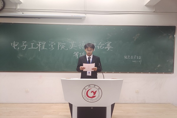 比赛开始前,由学生会工作人员首先进行比赛场地的布置,随后他们带着选手们提前进入等待区。接下来,由主持人程逢春陈述了比赛规则,并对人员进行分组以及辩题抽取,给予选手们二十分钟的准备时间去熟悉辩题。本次比赛人员分为两组,在第一组辩论开始前,由工作人员将参赛选手带到比赛区,自此辩论赛正式开始。在比赛过程中,各位选手积极参与,勇于发言,发挥出极高的水准。评委们根据选手们的发音、发言表现等方面进行综合评分。比赛依次进行,每一组的比赛都异常激烈,辩论如火如荼,电子工程学院的学生们用流利的英语展示了我院非凡的风采。经过两个小时的精彩比拼,最终获奖同学的名单如下: