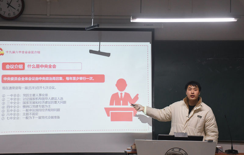 为深刻学习领会党的十九届六中全会精神实质和核心要义,激发广大青年党员奋斗前行的强大动力。12月16日下午,电子工程学院于慎思楼中102教室举办党的十九届六中全会精神宣讲会。本次会议由学院党委副书记孔鲲鹏主持,学院学生党支部全体党员与会。