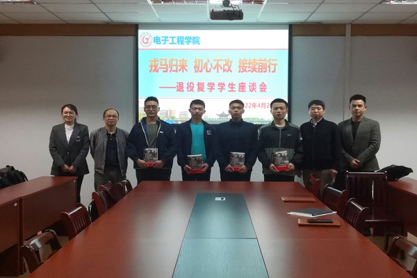 为做好对退役大学生的管理服务工作,深入了解退役大学生在校期间思想、学习、生活等方面的状况,加强对他们的关心和帮助。4月28日下午,电子工程学院召开“戎马归来、初心不改、接续前行”——退役复学学生座谈会。此次会议由电子工程学院党委副书记孔鲲鹏主持,电子工程学院副院长叶松,辅导员涂静、梁哲铭出席,退役大学生与会。