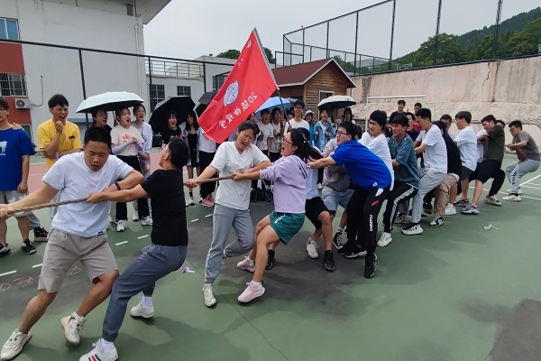 活动前期,由各班体委领取趣味运动会报名表,在班级中宣传并组织同学参加比赛,体育部结合报名情况进行分组。本次运动会一共四项比赛,分别是拔河、八字跳、圈圈过人及八人九足绑腿跑。活动开展阶段,首先进行的是拔河比赛,裁判员喊下开始后,各班级参赛选手奋力拼搏,团结一心,齐心协力完成比赛。第二个项目是八字跳绳,这是由两名同学摇动长绳,八名同学按“8”字路线不间断的跳过长绳的运动,选手们团结协作、相配配合完成了此次项目。第三个比赛是圈圈过人,每班派出十五名选手手拉手围成一个圈,呼啦圈依次穿过每一个人,用时最短的队伍获胜。最后一个项目是八人九足绑腿跑,各班级齐心合力、配合默契,选手们快步向前,以极短的时间完成了比赛。最后,各班级队伍合影留念。至此,本次趣味运动会结束,裁判记录成绩,各工作人员清理场地,收拾比赛用具。