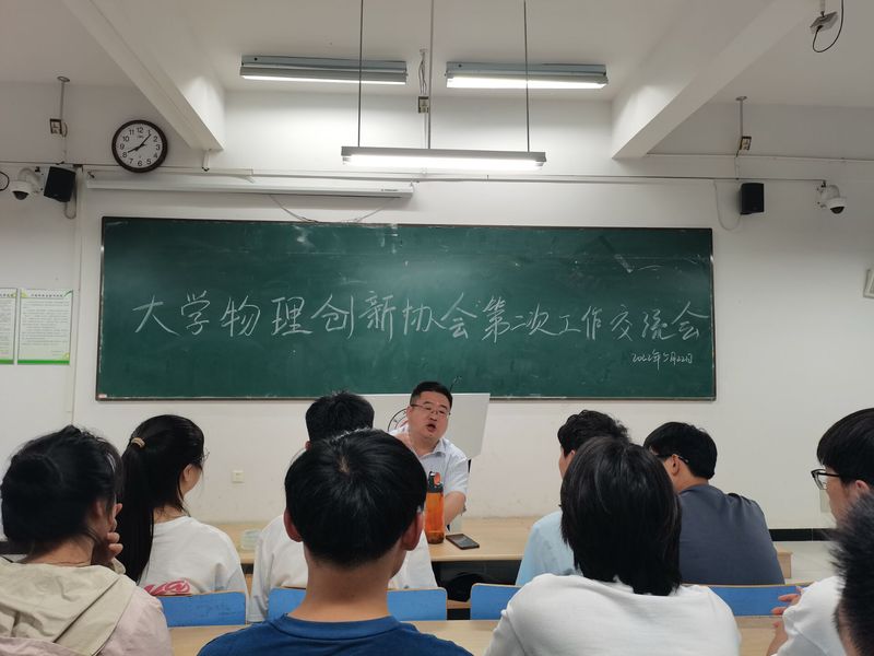 为规范大学物理创新协会各部门的工作,提高协会运作效率,电子工程学院大学物理创新协会于2022年5月22日晚8点半在慎思楼中502教室召开第二次工作交流会。协会会长任明阳主持了会议,协会各部门负责人参加了会议,协会指导老师笪诚教授到会指导。