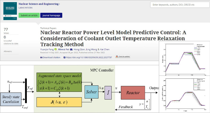 方愿捷的研究成果“Nuclear Reactor Power Level Model Predictive Control: A consideration of coolant outlet temperature relaxation tracking method”统一了反应堆中堆芯功率控制与冷却剂温度的模型预测控制(MPC控制)方法。通过优化设计了反应堆功率稳态情形下的冷却剂出口温度的参考轨迹计算环节,构建了双重目标跟踪的模型预测控制器并引入松弛因子保证控制系统的可解性。基于权重矩阵在控制器中的设定,实现了双重目标轨迹跟踪的倾向性设定,使得反应堆控制在参与电力系统调峰过程具备新的设计自由度。