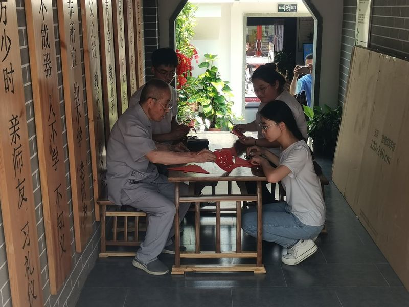 而后,牛家海向实践调研团展示其非遗剪纸作品,并教团队成员动手剪纸。牛老师认为,剪纸一定要细心,要有耐心。“现在的剪纸,已经不是单纯的剪,有剪、有刻、有剪刻结合,只有手法多样,才能让作品更加鲜活,更加精美”。
