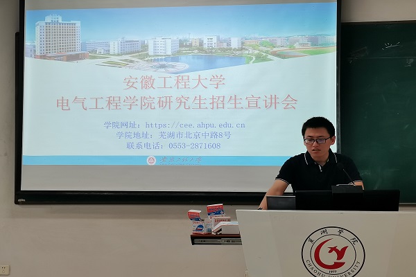 李炜向同学们介绍了安徽工程大学电气工程学院的办学宗旨与师资力量,并详细解读了安徽工程大学电气工程学院各类学术、专业硕士的研究方向及近年来电气工程学院的研究成果,鼓励各位有志向考研的同学积极报考安徽工程大学的硕士研究生,并积极与同学开展交流,耐心的解答了同学们的各种疑问。