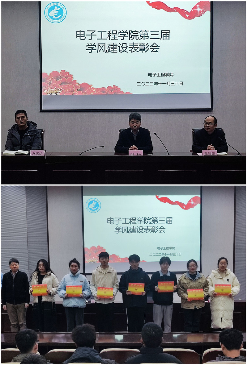 为学习贯彻党的二十大精神,巩固“三全育人”综合改革工作成效,树典型,立榜样,促学风,推进学院高质量发展,电子工程学院于11月30日在致知楼报告厅举办第三届学风建设表彰大会,院长叶松、党委副书记孔鲲鹏、副院长方愿捷出席,会议由辅导员涂静主持。