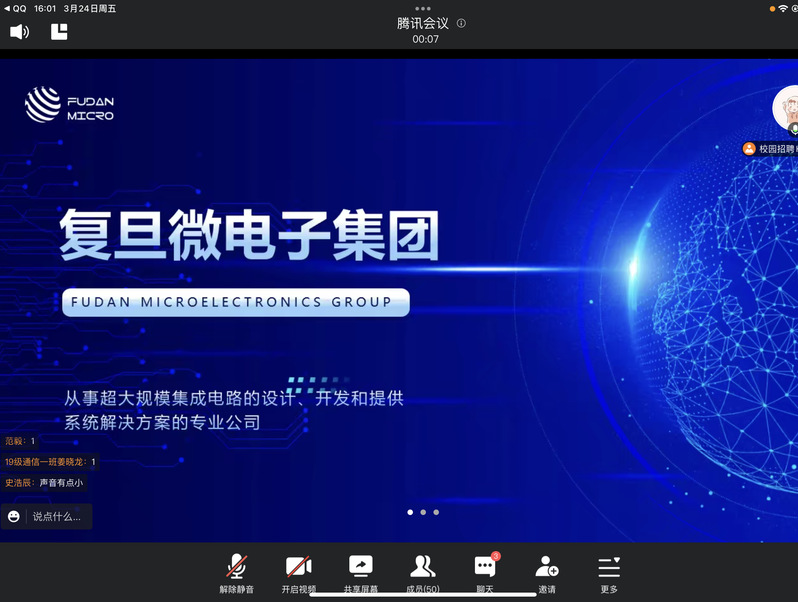 为了更好地拓宽毕业生就业渠道,助力毕业生积极就业。3月24日下午,电子工程学院举办上海复旦微电子集团股份有限公司线上招聘宣讲会,电子工程学院就业联络员涂静及2023届相关专业的毕业生参会。(文、图/涂静 审/孔鲲鹏)