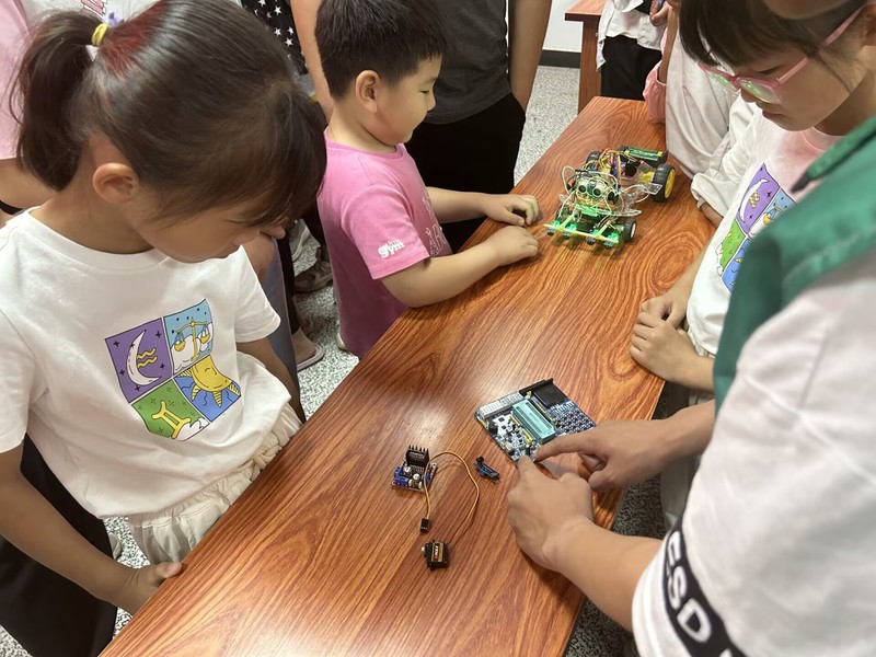 在活动中,志愿者们将视频与讲解互动相结合,在讲解智能小车和爱心流水灯基本原理的同时,给孩子们播放视频,充分调动了孩子们的热情,提高了孩子们对于科技知识的兴趣。在简单的原理讲解之后,孩子们在社区工作人员的带领下排队进入室外广场,由电子创新协会的同学给孩子们实际演示智能小车的操作过程,并邀请孩子们自己动手尝试操作小车,孩子们在志愿者的指导下操控智能小车,脸上洋溢着开心的神情。至此,上午的活动圆满结束。
