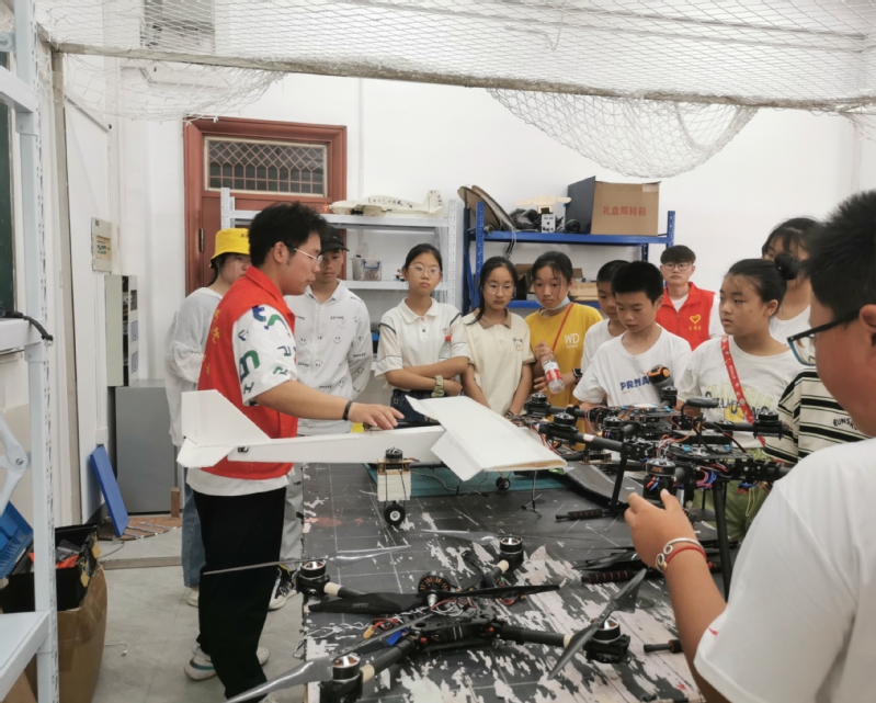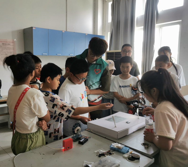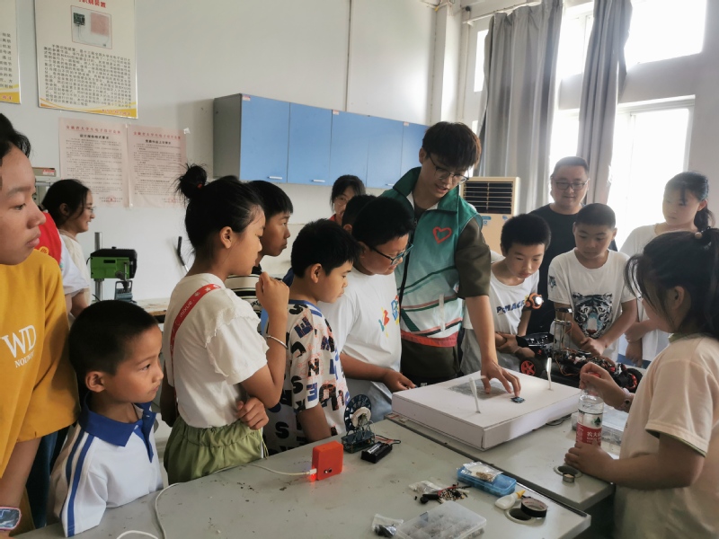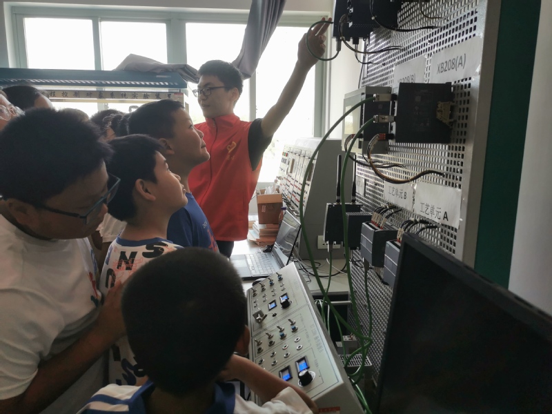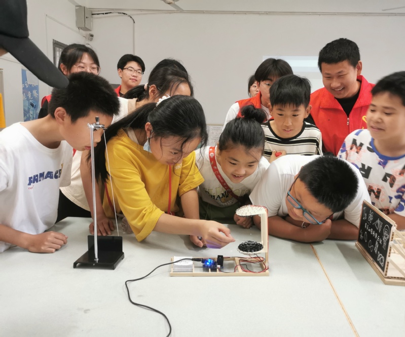 最后,青少年们前往大学物理创新协会、航模协会、电子创新设计协会、智能控制与创新协会进行参观,并进行互动体验。在大学物理创新协会志愿者的讲解下,孩子们了解了关于“李萨如图形演示”和“超声波悬浮”的知识原理,青少年们自己动手操作,收获颇丰;在航模协会,青少年们接触了飞机、火箭模型,并体验了模拟飞行;在电子创新设计协会,志愿者们演示了自制小风扇、“小蛮腰”照明灯以及智能小汽车,生动展示了科技就在我们身边;在智能控制与创新协会,各种智能制造设备映入眼帘,志愿者们仔细讲解了编程自动控制系统,青少年们进一步操作模拟开关、传输装置。