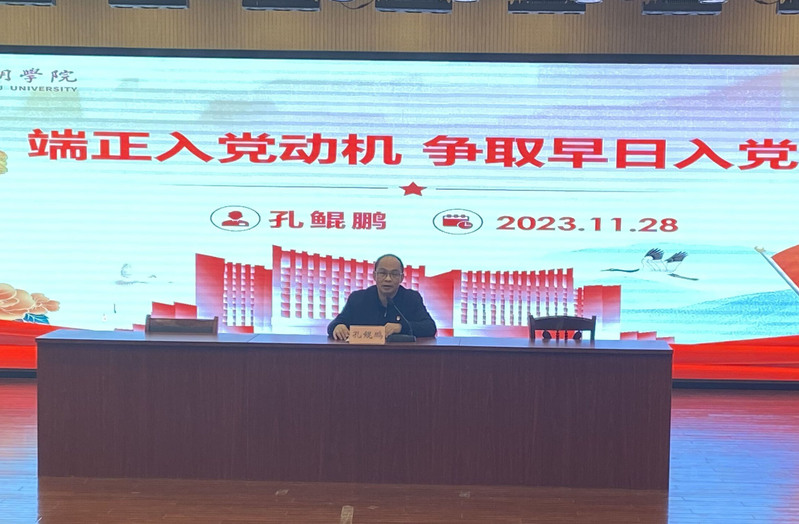 开班仪式结束后,孔鲲鹏以《端正入党动机 争取早日入党》为题开展党课第一讲。从党员发展的基本流程与要求、端正入党动机的重要性和如何端正入党动机展开详细说明。他要求学员们作为入党积极分子,要充分体现出先进性和积极性,一定要端正入党动机,坚定理想信念和政治立场,认真学习党的理论,做思想上的先行者;刻苦钻研专业知识,做学习上的佼佼者;热情工作,勇于实践,积极进取,做工作中的奉献者;团结同学,严格律己,热心助人,做生活中的模范者。(文、图/金晓瑞 初审/刘雪刚 终审/孔鲲鹏 发布/潘娟娟)