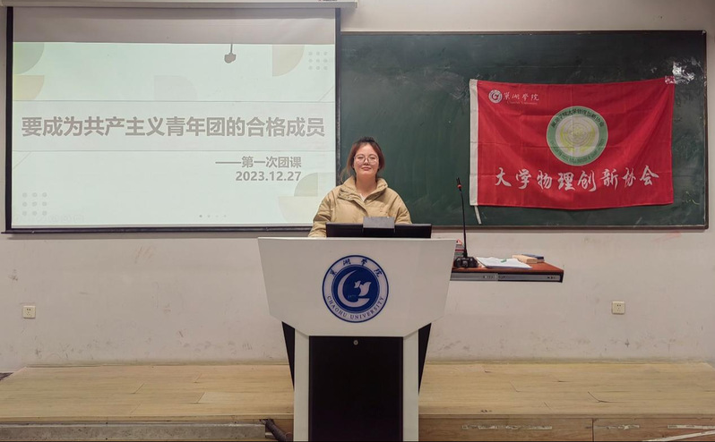 为进一步弘扬共产主义理念,加强大学生的青年团队建设和思想道德教育,12月27日,大学物理创新协会在慎思楼中102教室举办了第一次团课活动。本次团课由大学物理创新协会团支部书记李环月主持,团课主题是“成为共产主义青年团的合格成员”。