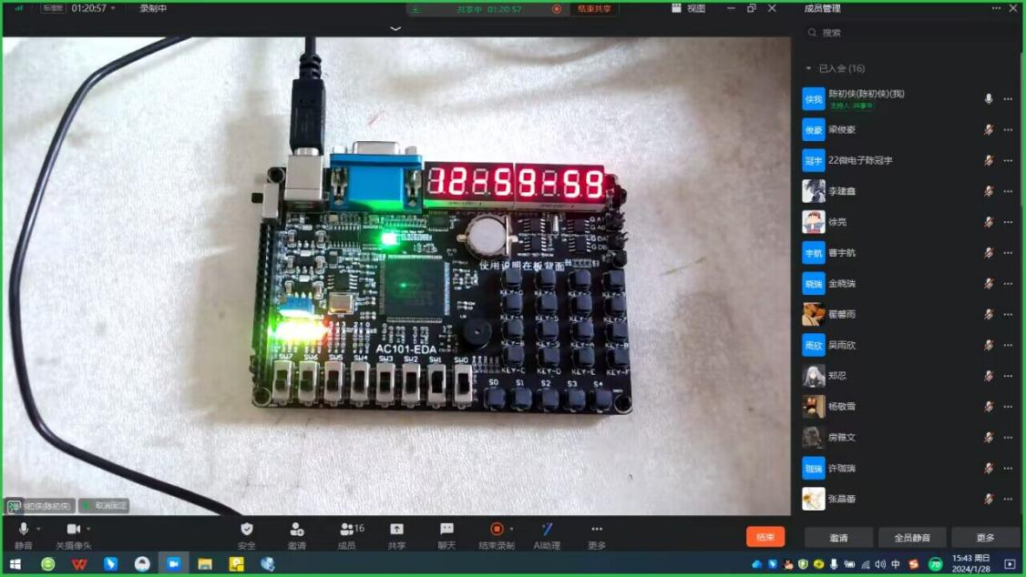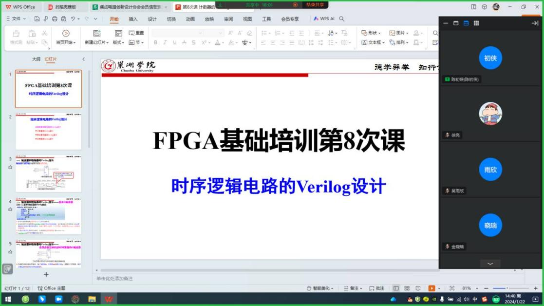 2024年1月15日至1月29日,电子工程学院集成电路创新设计协会于线上通过钉钉开展为期15天的寒假培训交流会。此次培训交流会由协会指导老师陈初侠主讲,培训课程名称为《FPGA设计基础》,全体协会成员参与。