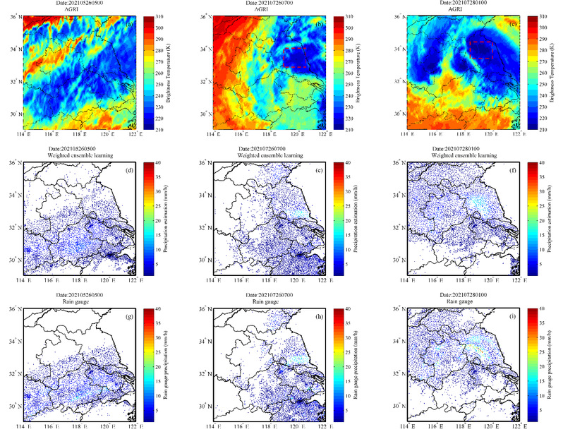 (d–f) precipitation estimated, and (g–i) rain gauge precipitation at different times.