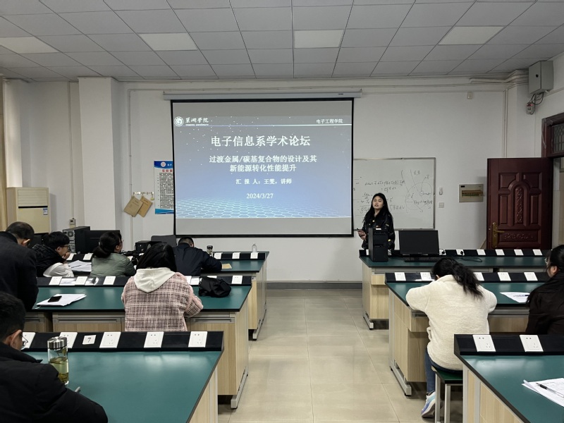2024年3月27日下午,电子工程学院电子信息系在致知楼2329召开展博士学术论坛,此次论坛由电信系王雯和孙权海两位博士分别作题为“过度金属/碳基复合物的设计及其能源转化性能提升”和“忆阻器建模及神经突触仿生研究”的学术报告。电信系全体教师参会,系主任刘双兵主持交流会。