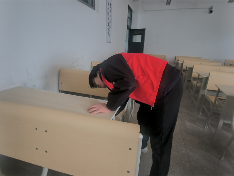 志愿者们被分配任务后,开始打扫各个教室的地面和桌椅,整理讲台物品,并擦除黑板字迹。打扫结束后,志愿者对各个教室进行检查,并将清扫工具归于原处。