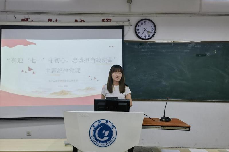 2024年6月26日,电子工程学院学生第二党支部书记周馨怡在博学楼105教室以《喜迎“七一”守初心,忠诚担当践使命》为题讲授纪律党课。