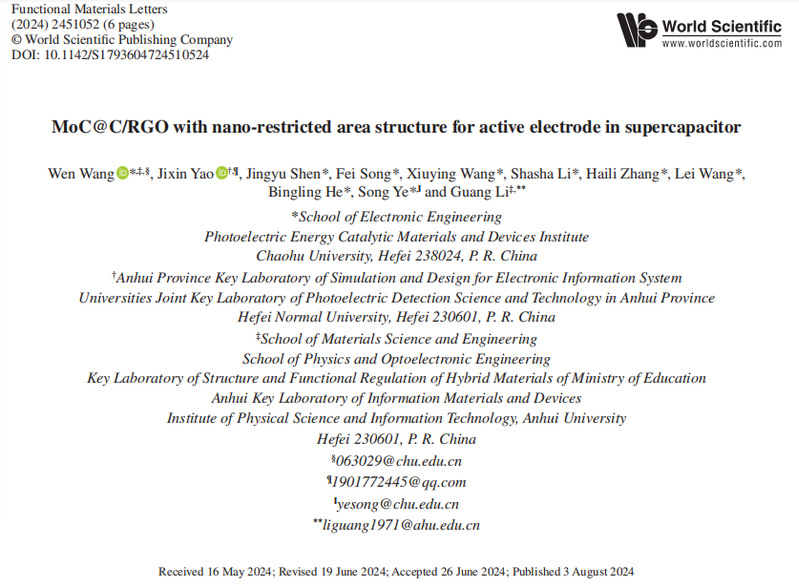 王雯博士(第一作者和通讯作者)通过纳米限域策略成功制备了MoC@C/RGO纳米材料,相关研究成功发表在《Functional Materials Letters》期刊。经测试,MoC@C/RGO作为超级电容器的活性电极材料,比电容值为420 F/g,在5000次循环的恒流充放电测试中电容保持率为97.6%,具有良好的电化学稳定性,为高效超级电容器的发展提供了新思路。
