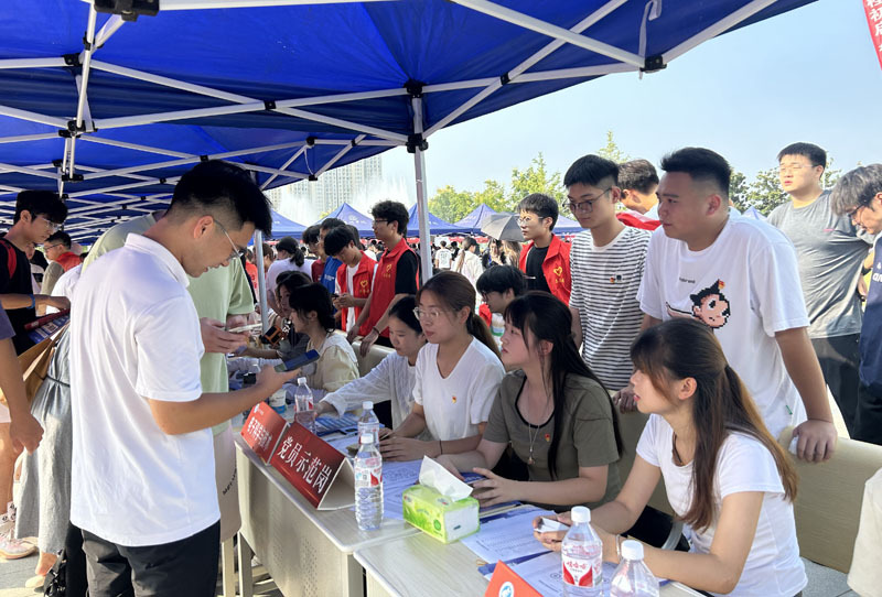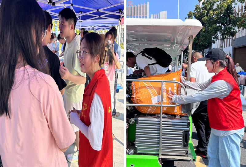 党员们早早地来到迎新现场,大家佩戴党员徽章,合理分工,以温暖的笑容、亲切的问候、贴心的服务迎接每一位新同学。