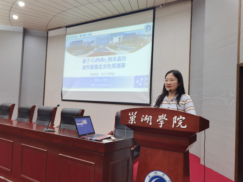 韩博士结合自身在纳米晶/量子点光电探测器方面的研究经历,以《基于CsPbBr3纳米晶的高性能稳定光探测器》为主题,深入浅出地阐释了全无机钙钛矿CsPbBr3纳米晶基光电探测器的性能优化研究思路,采用了钝化缺陷、促进载流子传输、拓宽光谱响应范围、优选电极等方面协同研究方法,获得了高性能、宽光谱、低成本的稳定光电探测器研究成果,为柔性电子器件的应用提供了新思路,为解决传统光探测器的难题提供了新途径。报告会后,与会师生同韩博士就科学研究细节、钙钛矿稳定性及其产业化应用等方面展开了热烈的互动交流。
