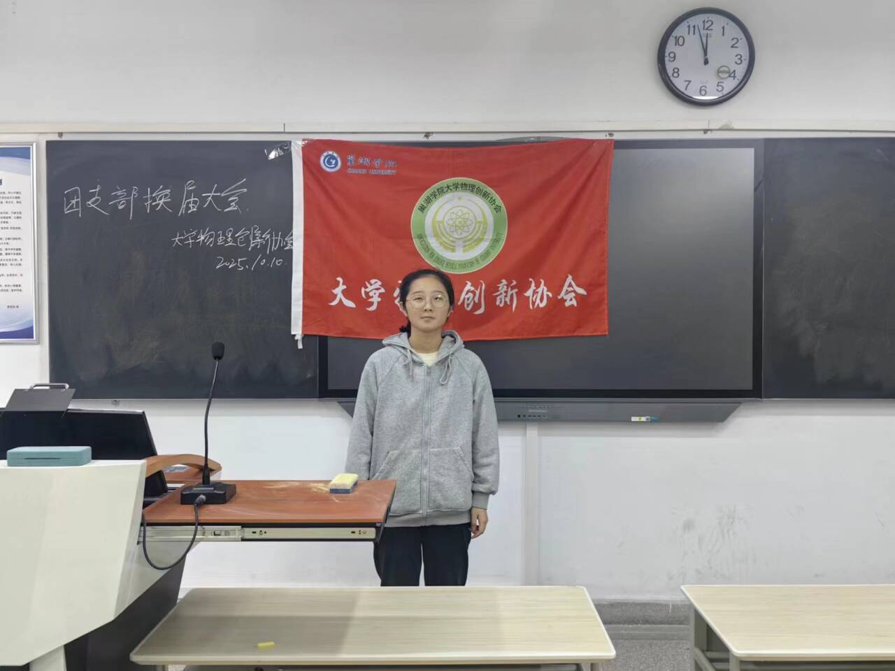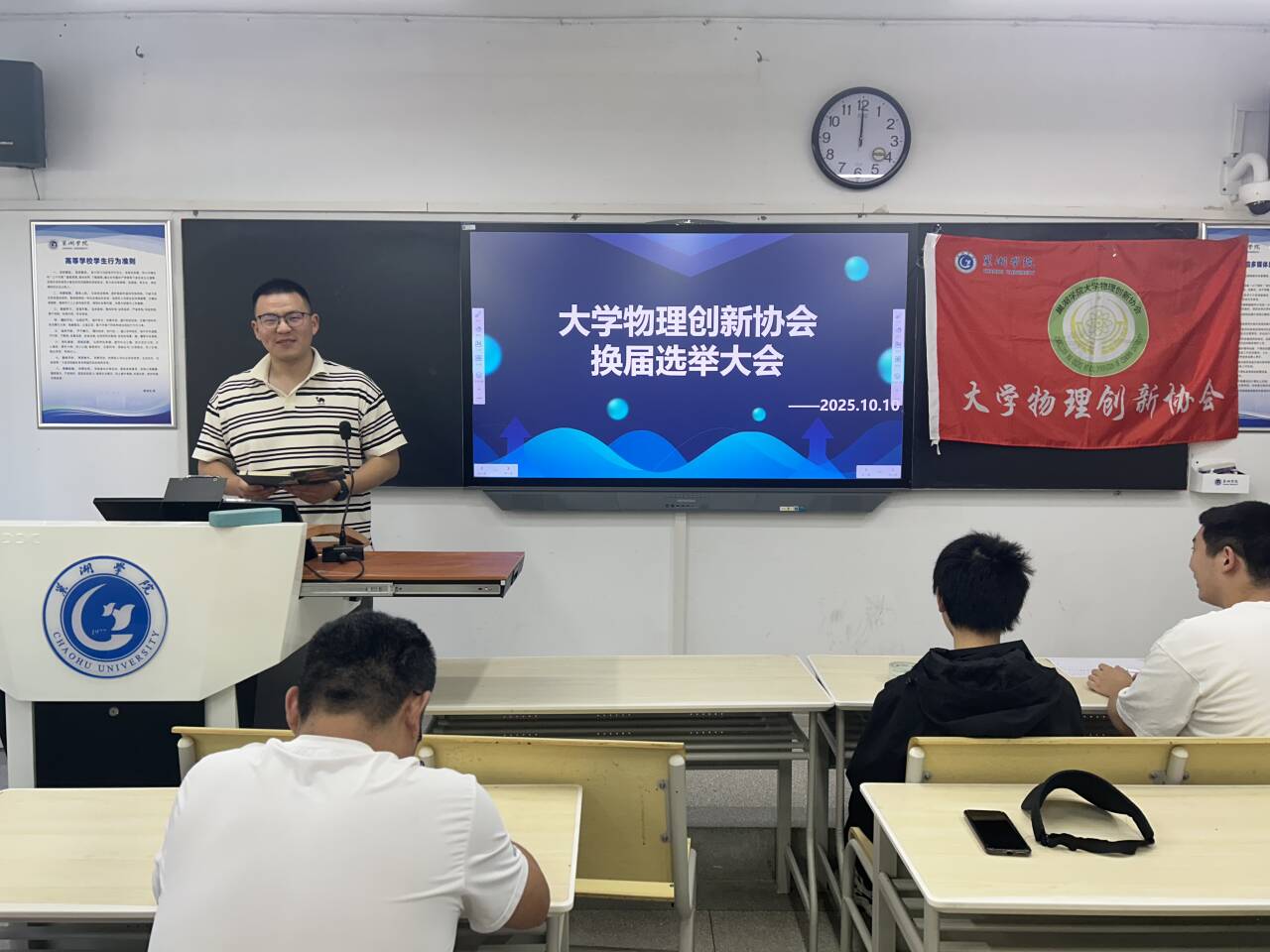 根据校团委和电子工程学院团委的部署,2025年10月15日中午,大学物理创新协会在博学楼113教室举办了社团换届大会。协会各部门干事以及会员近50人参与,协会指导老师杜成名到会指导,会议由干文海主持。