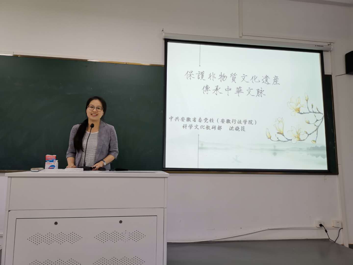 5月29日,中共安徽省委党校沈晓筱博士应环巢湖研究中心的邀请,来必赢626net入口作《保护非物质文化遗产,传承中华文脉》专题学术报告。环巢湖研究中心主任张安东主持报告会,校非物质文化遗产保护协会、相关人文院系师生等100余人聆听报告。