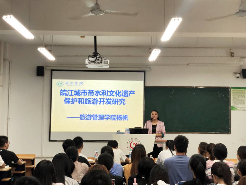 环巢湖中心专职研究员杨帆副教授于9月29日晚上在博学楼310教室,举办了题为“皖江城市带水利文化遗产保护和旅游开发研究”的学术讲座。旅游管理学院2018级旅游管理专业学生聆听了本次讲座。