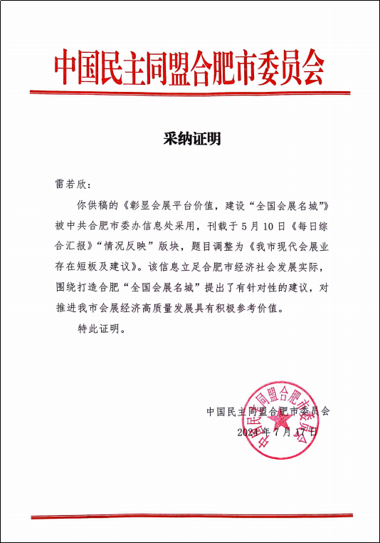 近期,旅游管理学院雷若欣团队完成的《彰显会展平台价值建设“全国会展名城”》被中共合肥市委办信息处采用,刊载于5月10日《每日综合汇报》“情况反映”版块,题目调整为《我市现代会展业存在短板及建议》。该信息立足合肥市经济社会发展实际,围绕打造合肥“全国会展名城”这一目标,分析了合肥市会展业目前还存在国际展会品牌缺乏、场馆布局不均、展产联动不强等问题,并就此提出了发展核心区域综合会展圈、城内文化休闲会展圈、南北枢纽会议会展圈、城市南缘生态休闲会展圈的策略与措施,对推进合肥市会展经济高质量发展具有较好的参考价值。(文/图 曾鹏 民盟合肥市委 初审/雷若欣 终审/朱明)