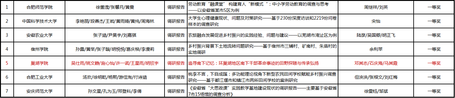 近日,2024年“新时代•新思想•新青年”安徽省大学生学习马克思主义理论成果大赛评审结果公布。环巢湖研究中心研究员邓其志、马其霞指导22级会展专业吴仕雨、姚文静、施心怡、许一诺、王星雨、胡欣宇等同学以作品《追寻南下记忆:环巢湖地区南下干部革命事迹的田野探赜与传承弘扬》荣获调研报告类一等奖(一等奖全省共11篇)。