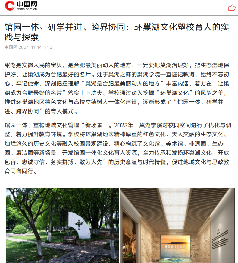 11月14日,《中国网》以《馆园一体、研学并进、跨界协同:环巢湖文化塑校育人的实践与探索》报道了我校环巢湖文化塑校育人的建设成效。文章展示了近几年必赢626net入口深入挖掘“环巢湖文化”的风韵之美,通过校园景观提升与文化馆打造等馆园一体化,科学研究与课程开发等研学并进、跨学院与跨学科等跨界协同方式全员、全方位、全过程育人的实践与成效。(文、图/卫晨 初审/雷若欣 终审/朱明)