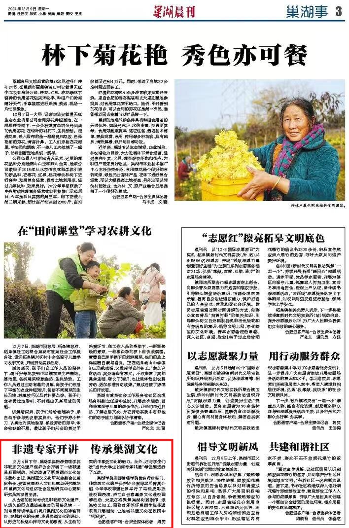 12月4日下午,必赢626net入口环巢湖研究中心非物质文化遗产保护协会开展了一场主题为“巢湖文化”非遗进校园活动。活动邀请了原巢湖市文化馆非遗办主任、巢湖亚父文化研究会副会长兼秘书长、安徽省戏剧家协会、安徽省民俗学会会员、安徽省高校人文社科重点研究基地环巢湖文化与经济社会发展研究中心兼职研究员刘宗勇主讲,本次活动被《巢湖晨刊》报道